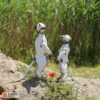 We spray our metal sculptures with clear gloss lacquer to prevent them from rusting so they can be placed outside. For information on maintaining your sculpture please see our FAQ page.